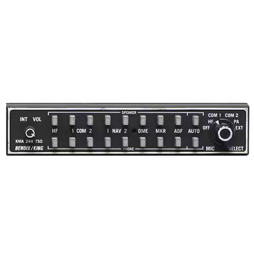 The KMA 29 audio control panel provides audio system control for the cockpit crew and passengers. The panel also provides an interface to the passenger address (PA) system, aural warning system, and includes a marker beacon receiver. The audio panel is used to make audio selections for all audio communications to and from the cockpit crew. Audio outputs from the panel include a cockpit speaker and headphone jacks (noise-canceling headsets can be used with the audio panel).