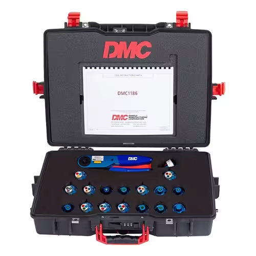 The DMC1186 kit provides the information and accessories necessary to use an AF8 (M22520/1-01) Standard Adjustable Crimp Tool and included accessories for crimping size 12 to 26 electrical contacts. The AF8 gives a Mil-Standard 8 impression crimp, which assures maximum tensile strength. The cycle controlled precision ratchet assures consistently accurate crimps every time. The tool frame has a built-in 8 step selector knob for ease in dialing the correct crimp depth setting for the wire being used.
