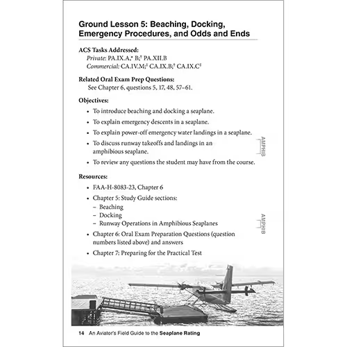 The thorough study guide covers seaplane basics, reading the water surface, assessing the landing area, preflight procedures, maneuvering on the water, takeoffs and landings, beaching, docking, and important procedures and safety considerations specific to amphibious seaplanes. This guide will provide students with the knowledge and confidence to earn their ASES rating and become safe and competent seaplane pilots.