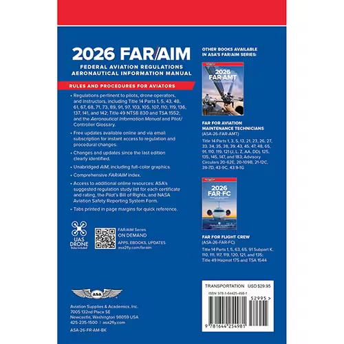 ASA has built a reputation for providing the aviation community with the most accurate and reliable FAR/AIM products available. The 2026 FAR/AIM book contains complete and up-to-date information from Titles 14 and 49 of the Code of Federal Regulations (14 and 49 CFR) pertinent to General Aviation, Sport Pilots, Flight Instructors, and Unmanned Aircraft System (UAS) operators, combined with the Aeronautical Information Manual (AIM), and a FREE email subscription service for you to receive updated information as it is released by the FAA.