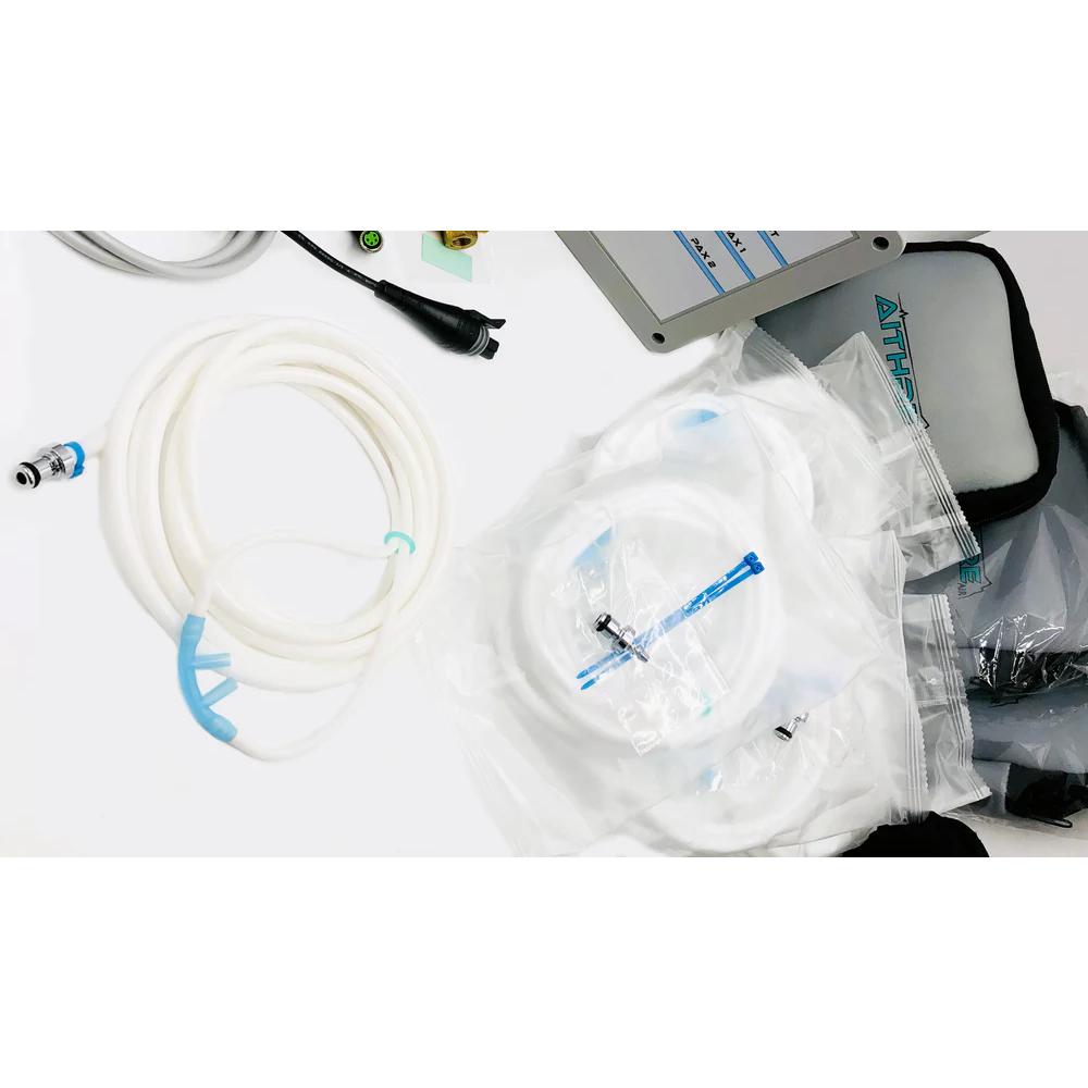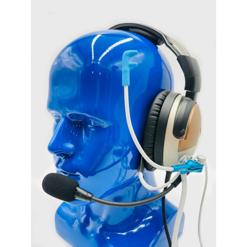 While the AVI system includes two silicone cannulas, the AVI system additionally includes two Aithre Boom Cannulas to make oxygen delivery safer and more comfortable.  The Boom Cannula features a low profile aluminum anodized swivel adapter and an articulating boom arm, make oxygen delivery as easy and convenient as talking on the microphone.  When not in use, the Boom Arm can be pushed or swiveled up and out of the way and can be easily recharged with a new nasal arm after extended periods of use.