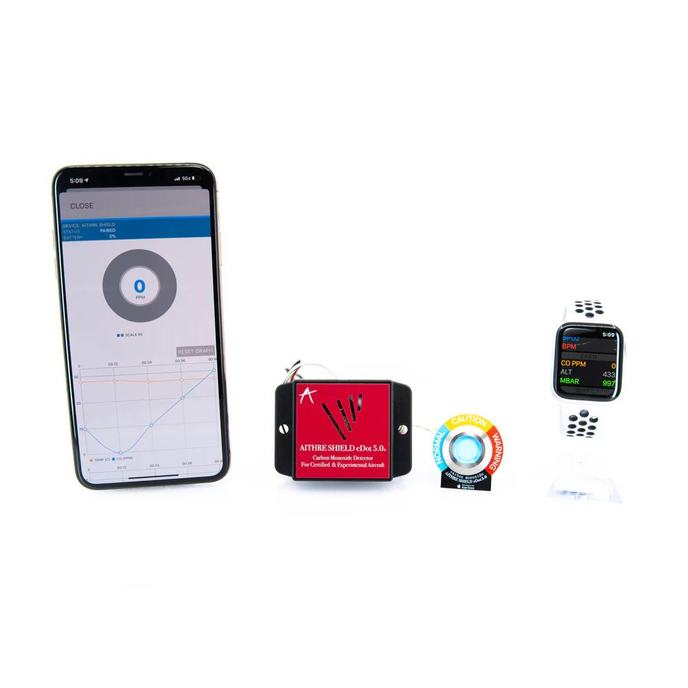 No oxygen system is complete without the Aithre Shield carbon monoxide detector, so the AVI system includes either the Shield EX 3.0 (experimental) or eDOT 5.0 (certified). Â The Shield CO detectors offer superior 10 year no recalibration service with sensitivity below 10 ppm and responsiveness of under 60 seconds.
