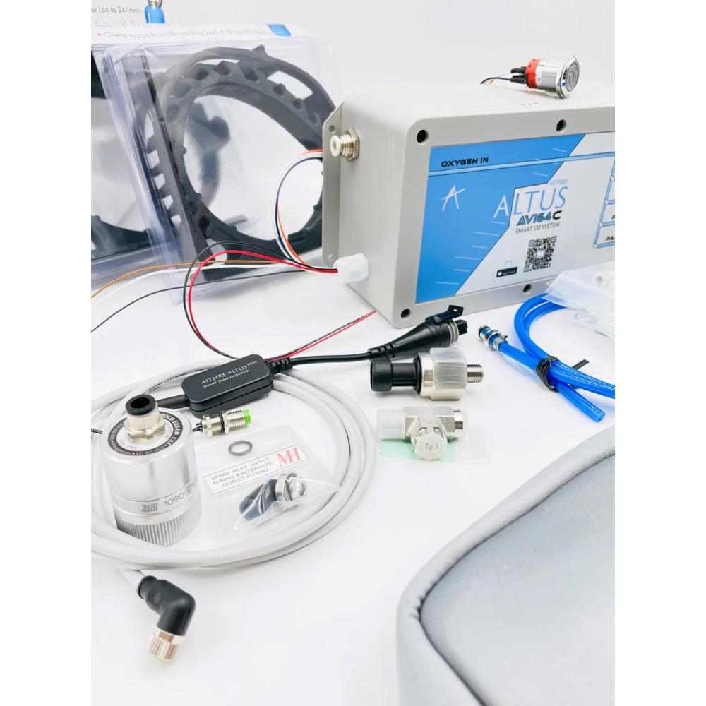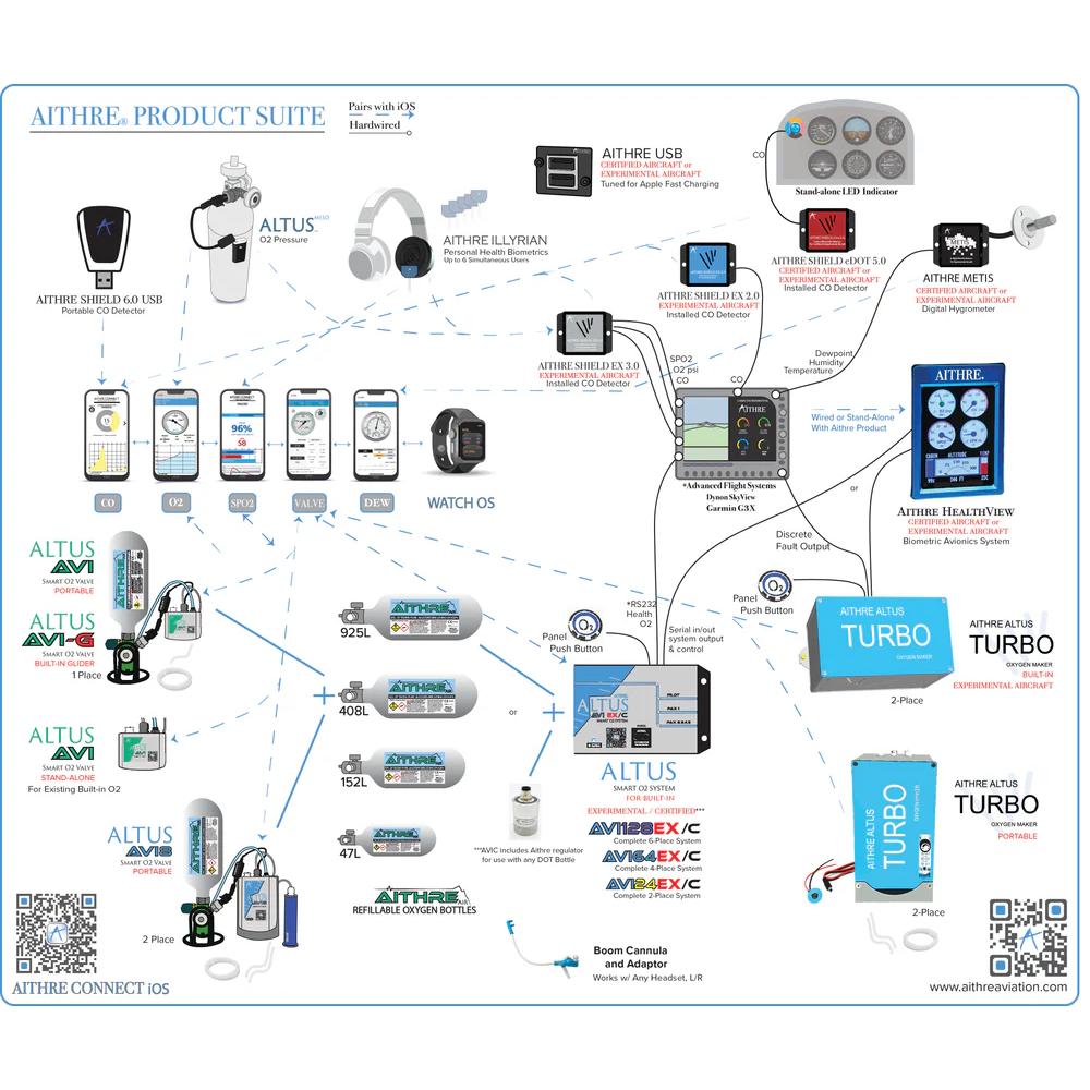 The AVI system is a complete kit for health and hypoxia management in light aircraft, including the AVI control unit, HealthView, Illyrian oximeters, Aithre Boom Cannulas, Shield carbon monoxide detector, carbon fiber composite bottles, plumbing, ports, mounts, and more. Â The system is everything you need for installation to support oxygen delivery in combination with health monitoring of blood oxygen, heart rate, carbon monoxide, oxygen flow, and more.