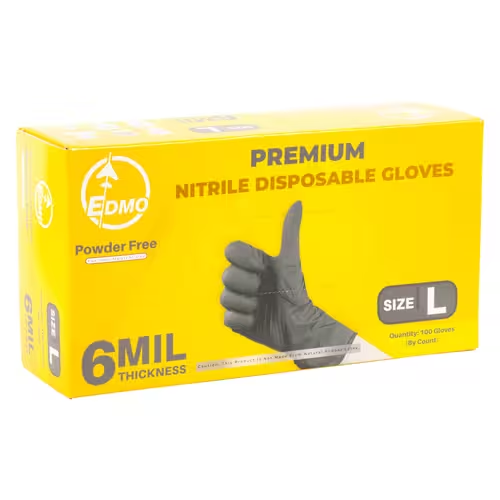 This nitrile protective glove is black, has a 6-mil thickness, sizes small, medium, large, and extra large. 100 gloves per box.