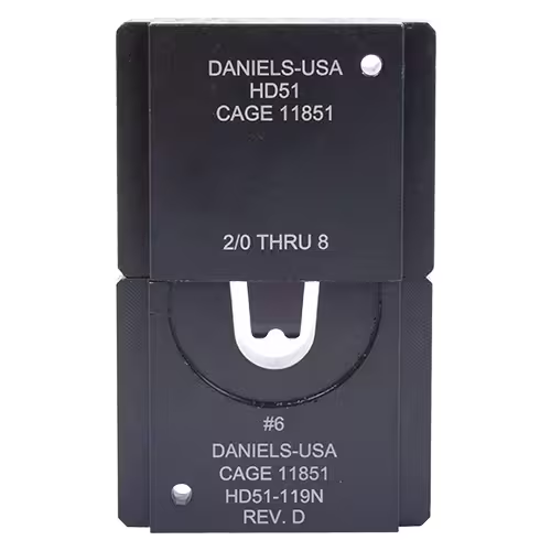 This die set is a double indent die set with a 0.126 cavity used for crimping #6 uninsulated terminals and is compatible with the HD51, XHD51, and HDE51C crimp tools.