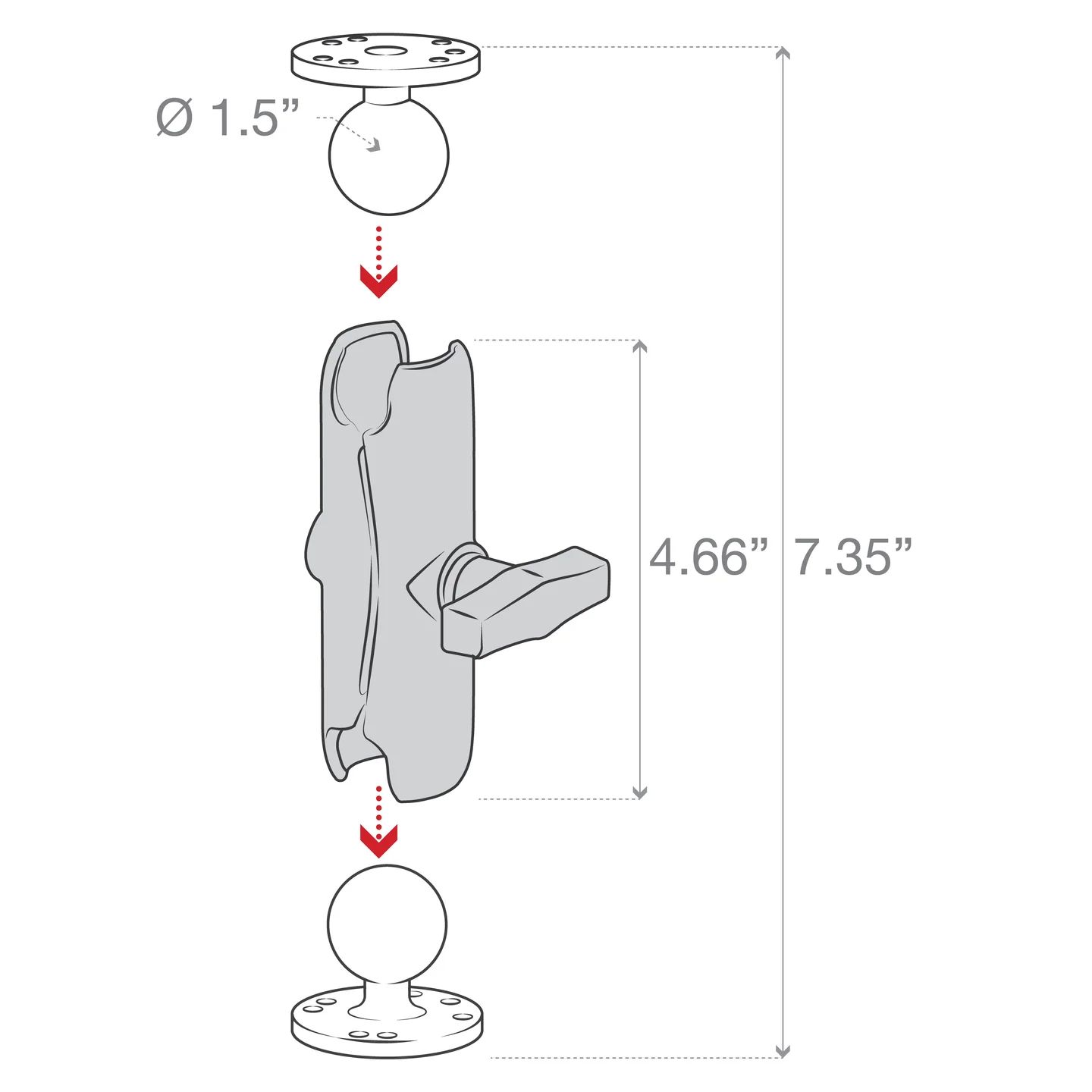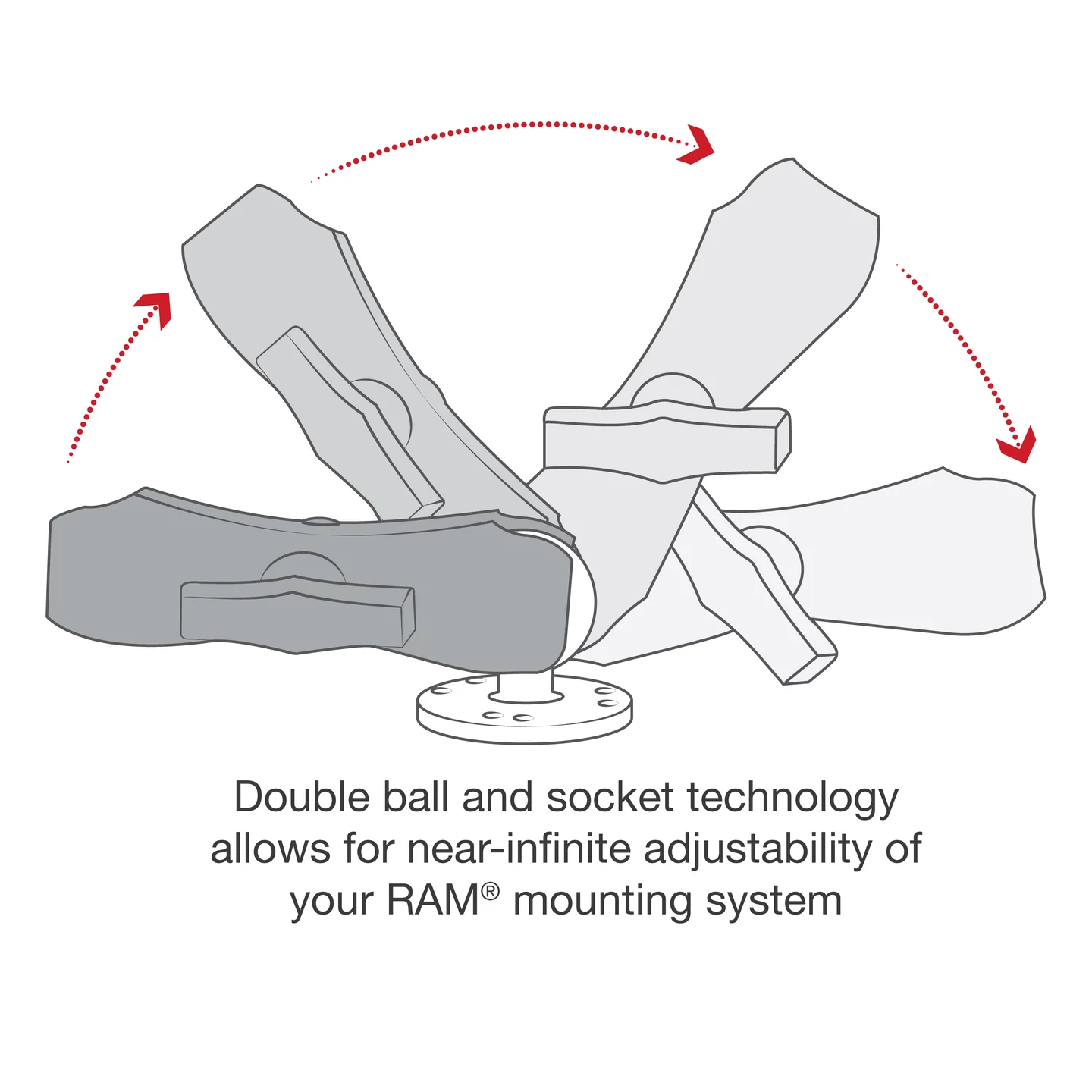 - Includes two round ball bases and C size medium length double socket arm; ball and socket technology allows for near-infinite adjustability