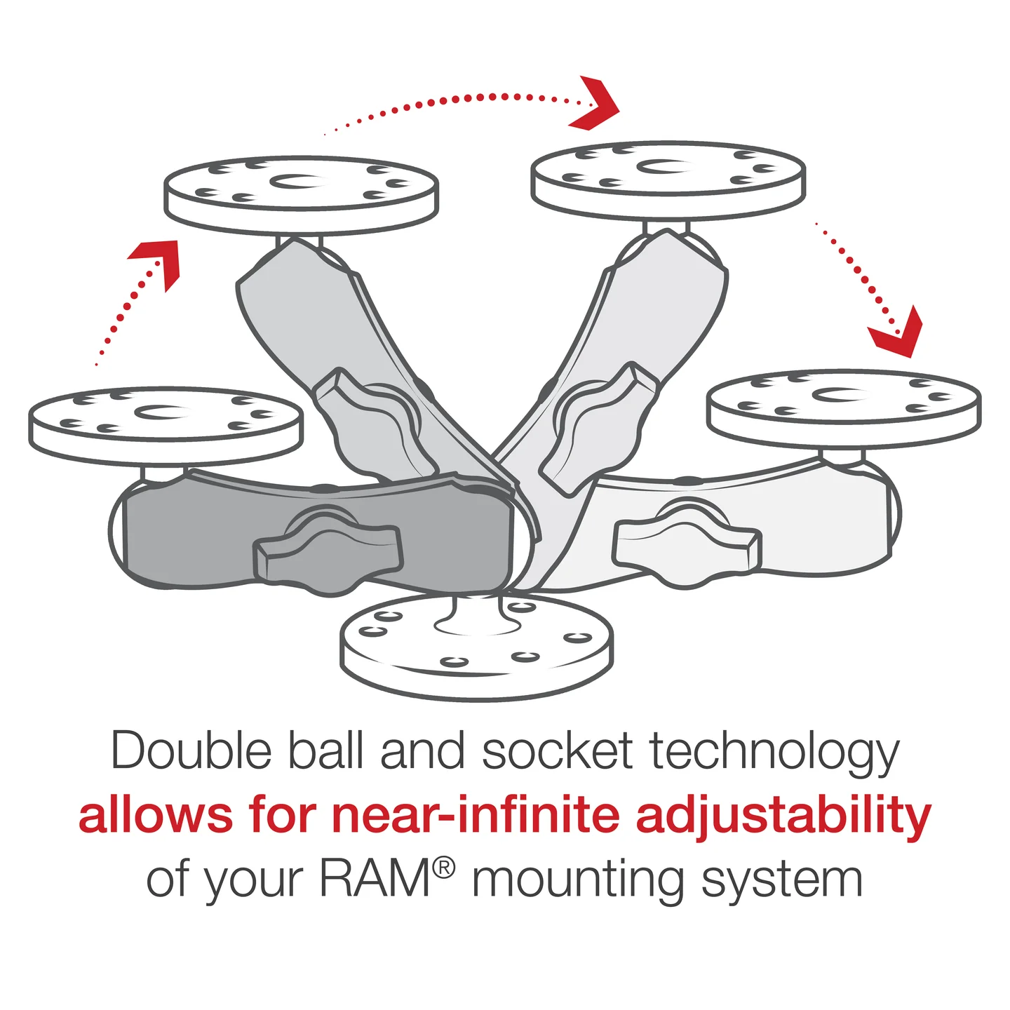 • Attaches to any B size RAM® ball component, including mounting bases and device holders; double ball and socket technology allows for near-infinite adjustability of your RAM® mounting system