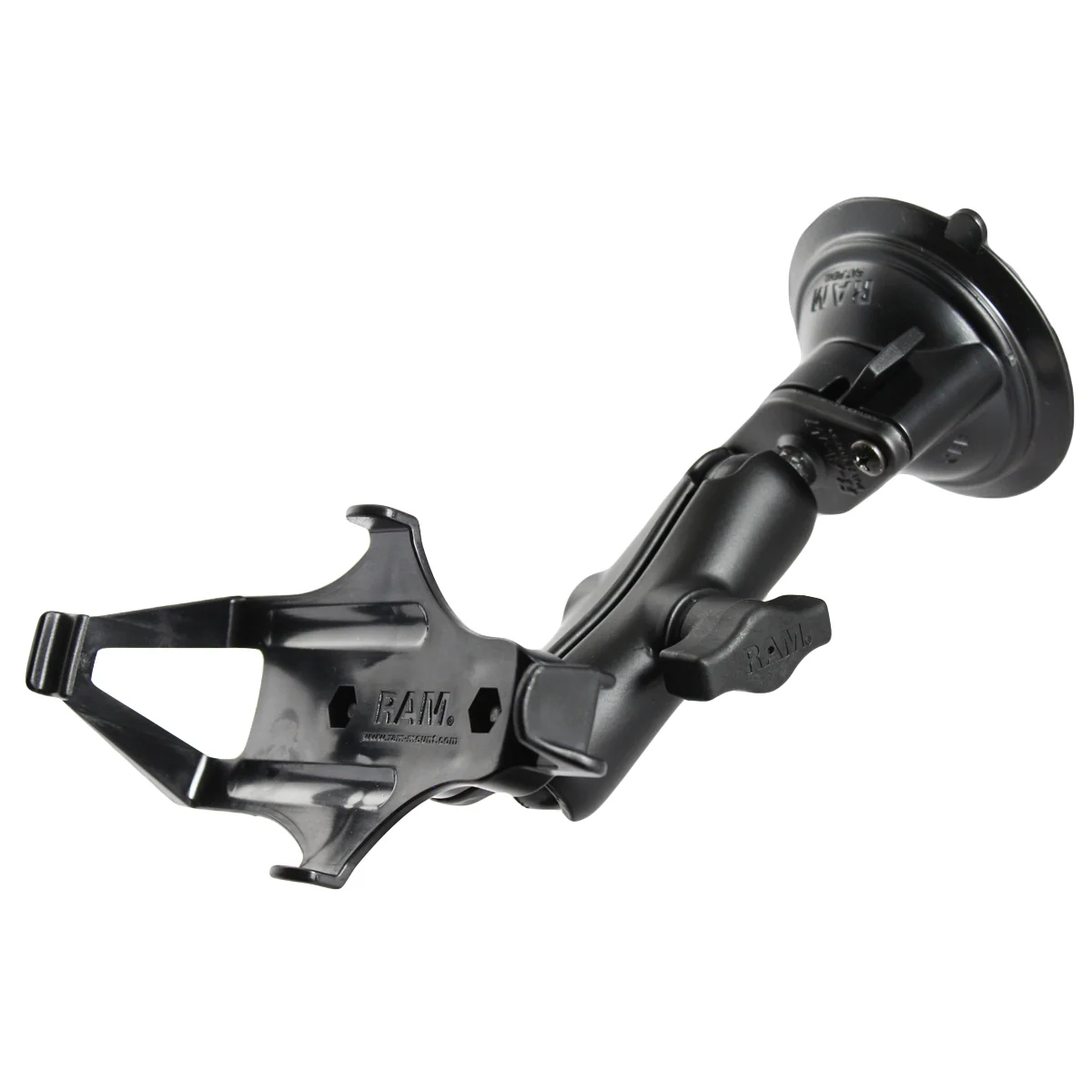 The RAM-B-166-GA7U consists of a 3.3″ suction cup twist lock base, double socket arm and custom high strength composite cradle for the Garmin GPSMAP. The suction cup base is designed to have a strong hold on glass and non-porous plastic surfaces, including RAM adhesive disks. The mount is designed with a RAM 1″ diameter patented rubber ball and socket system that has adjustment points at both ends of the double socket arm; this allowing for almost infinite adjustment and perfect viewing angles.