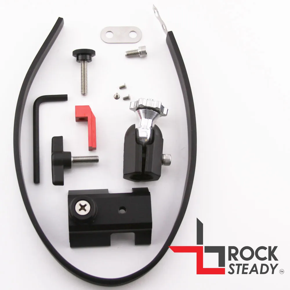 The Rock Steady Universal Strut Base is a quality all metal machined aluminum base. The strut base fits any size aircraft spreader bar, bi-plane strut, or wing strut from a J-3 to a Caravan. The simple clean design straps firmly to your wing strut without using bulky blocks or bolts. The Cushioned Steel Strap Kit is the ultimate safe and secure universal strap. The stainless metal strap is cushioned with a rubber anti-chafe cover protecting your painted surface. The strap and cushion assembly is cut to fit any size strut from a J-3 to a Caravan. The strap is tightened by hand with a thumb screw for a temporary attachment that is very rigid to hold your camera as stable as possible.