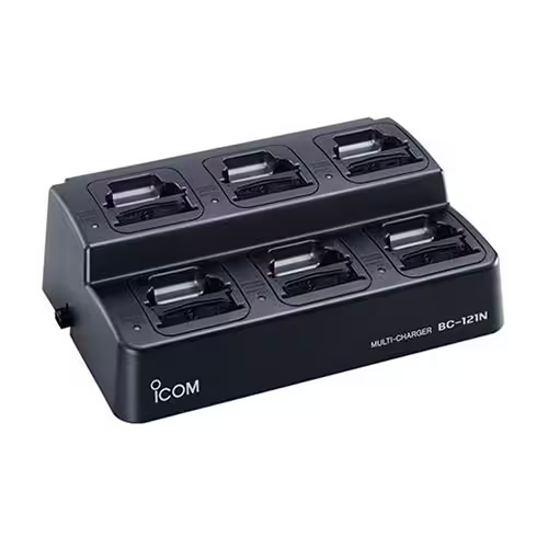 The BC-121NS charging unit accommodates up to six units simultaneously. The Multi-Charger consists of the base unit and six AD110 adapter cups.