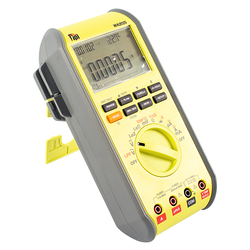 The TPI WA2025 handheld multimeter includes a Wire Fault Test that finds short circuits in wire runs and displays the distance to the short. The low 50 Ω resistance range, supported by a stable 20 VDC 10 mA output, ensures stable measurements, while the Low Z voltage mode reduces ghost readings in complex electrical environments. The WA2025 features Bluetooth 5.0 connectivity for remote viewing and report creation, and a rugged IP51 rated housing.
